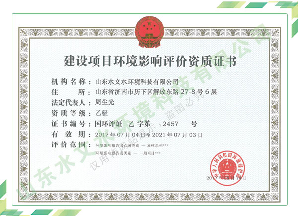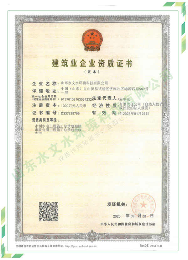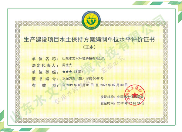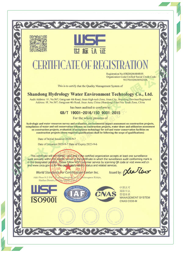 公司擁有水利工程設(shè)計(jì)、水土保持、水文水資源調(diào)查評價(jià)、水資源論證、建設(shè)項(xiàng)目環(huán)境影響評價(jià)、市政公用工程施工總承包、水利水電工程施工總承包、電子與智能化工程專業(yè)承包等資質(zhì),2017年通過質(zhì)量管理體系、環(huán)境管理體系、職業(yè)健康安全管理體系認(rèn)證;2020年被評為國家級(jí)高新技術(shù)企業(yè),同年被中國水利企業(yè)協(xié)會(huì)推薦為第一批“合同節(jié)水服務(wù)企業(yè)”;2021年被山東省、濟(jì)南市評為 “專精特新”中小企業(yè)。業(yè)務(wù)范圍涉及水利工程設(shè)計(jì);節(jié)水設(shè)計(jì)、改造、水平衡測試;山洪災(zāi)害調(diào)查;城市水資源調(diào)查評價(jià);建設(shè)項(xiàng)目水土保持方案編制、監(jiān)測、驗(yàn)收、水土保持規(guī)劃;水安全保障規(guī)劃、建設(shè)項(xiàng)目水資源論證、規(guī)劃水資源論證;建設(shè)項(xiàng)目環(huán)境影響評價(jià);入河排污口論證;防洪影響評價(jià);市政公用工程施工、水利水電工程施工、電子與智能化工程施工等。